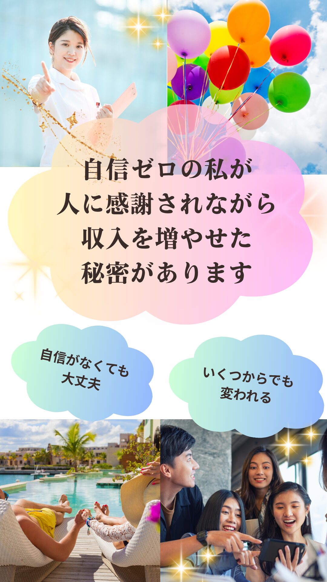 収入を増やしたいけど、不安や迷いばかりで何も始められませんでした。でも、メルマガを読み始めて「小さな一歩でもいい」と思えるようになり気づけば、不安よりわくわく勝つようになり、毎日が前向きに変わっています。Bさん(42歳・女性、パート主婦) |